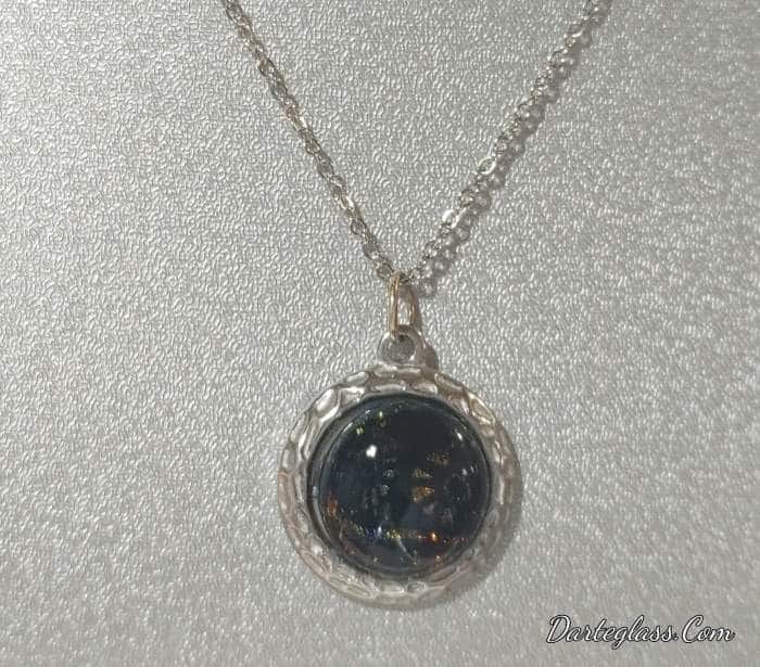 Art Deco designed glass dichroic pendant, set in 22mm round stainless steel setting. Includes 24″ stainless steel chain