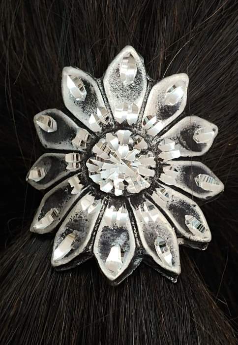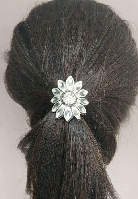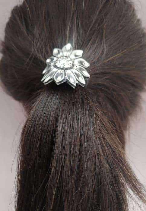 This hand crafted pewter pony tail cover slides inside the pony tail band in your hair. It has diamond cuts that reflect light and accent the details of the piece. You’ll love how it looks in your hair and you’ll get loads of compliments. Lead free!