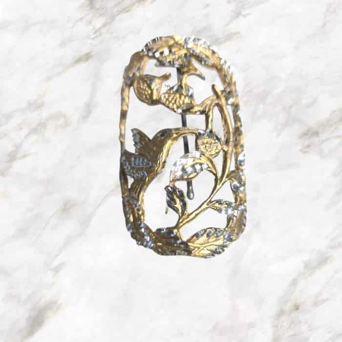 This beautiful gold toned hummingbird is a handcrafted pewter pony tail cover, that slides inside the pony tail band in your hair. It has diamond cuts in it to reflect light and accent the details of the piece. You’ll love how it looks in your hair and you’ll get loads of compliments. Lead free!