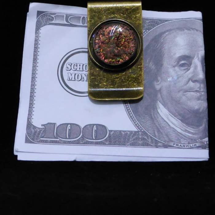 Golden brown with green specs small Money Clip is antique brass with 1/2 inch round dichroic fused glass center.