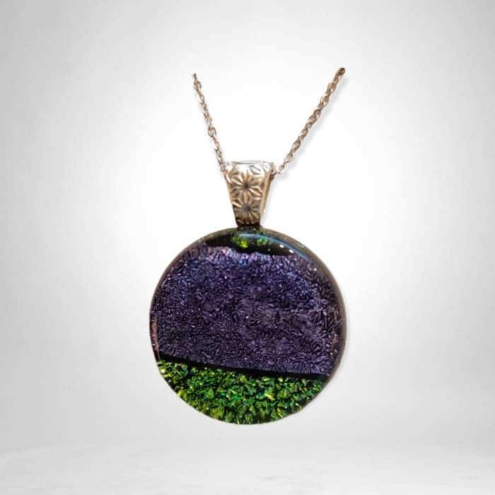 Purple and Green Crinkled Dichroic Round Pendant. Only weighs .08 ounces. You’ll hardly know it there.