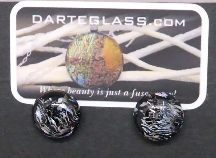 Post earrings are 1/2 inch round, set on hypoallergenic posts, secured with rubber backings. They won’t turn your ears green! Unique, handmade dichroic fused glass. Very light in weight. You’ll hardly know you have them on, but everyone who sees them will notice!